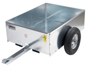 Přívěsný vozík z pozinkovaného plechu s výsuvnou zadní částí. Maximální nosnost je 200 kg, rozměry jsou 106,5x76,5x30,5 cm.